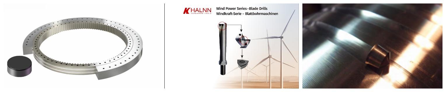 華菱新一代全貼面PCD刀具:針對(duì)風(fēng)電軸承球溝道硬車,華菱提供RNGN全貼面PCD/PCBN刀片,高耐磨性實(shí)現(xiàn)高質(zhì)量精加工。針對(duì)風(fēng)電葉片法蘭孔的鉆削,華菱超硬提供PCD全貼面U鉆刀片,具有優(yōu)異的耐磨性,主要以W形和S形為主,可轉(zhuǎn)位3-4次,降低生產(chǎn)成本,同時(shí)可承受更高的切削速度和進(jìn)給速度,配合剛性優(yōu)異的刀桿,在保持尺寸精度的同時(shí)實(shí)現(xiàn)穩(wěn)定高效的鉆削。針對(duì)碳化鎢輥環(huán)(硬度> HRA 88),華菱提供全貼面PCD刀片RCGX型號(hào)。