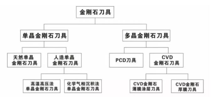 聚晶金剛石刀具則分為聚晶金剛石刀具(簡稱:PCD)、化學氣相沉積法金剛石刀具(簡稱:CVD)兩大類,而化學氣相沉積法金剛石刀具又可以分為CVD金剛石薄膜涂層刀具和CVD金剛石厚膜涂層刀具兩大類。